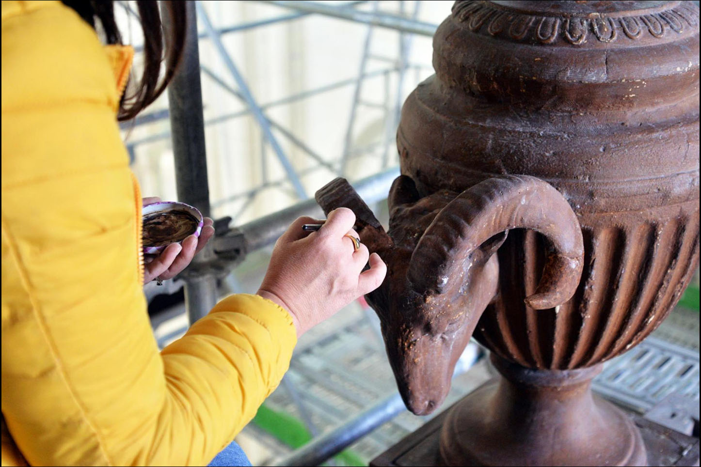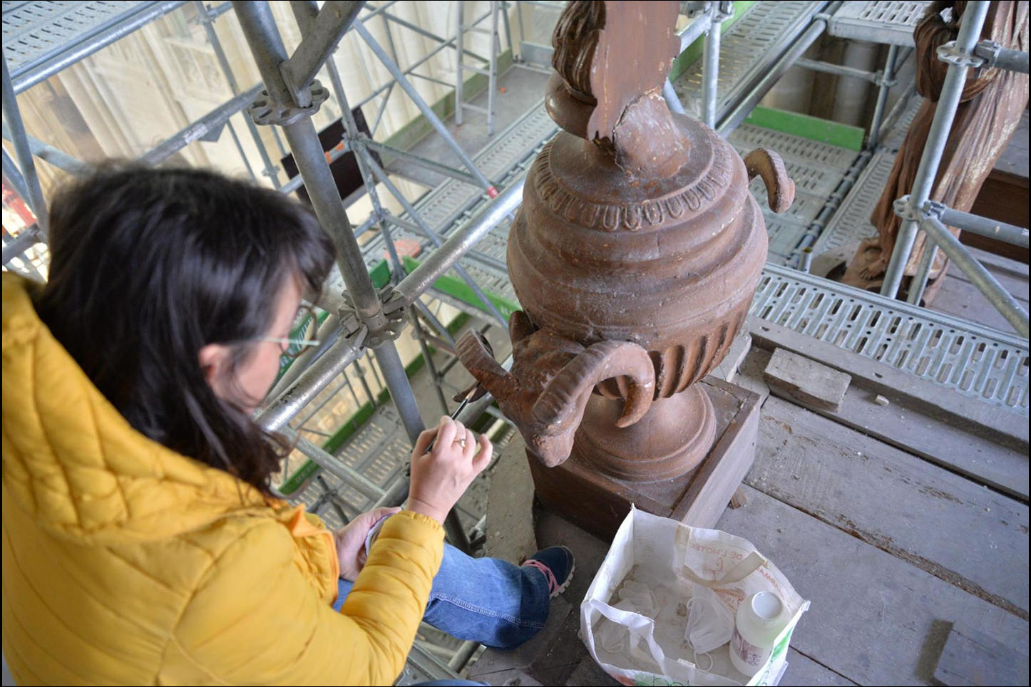 Les spécialistes de la restauration ont profité de cette opportunité pour reprendre quelques dégradations sur le buffet de l’orgue et procéder à des prélèvements d’échantillons et à la restauration de peintures.