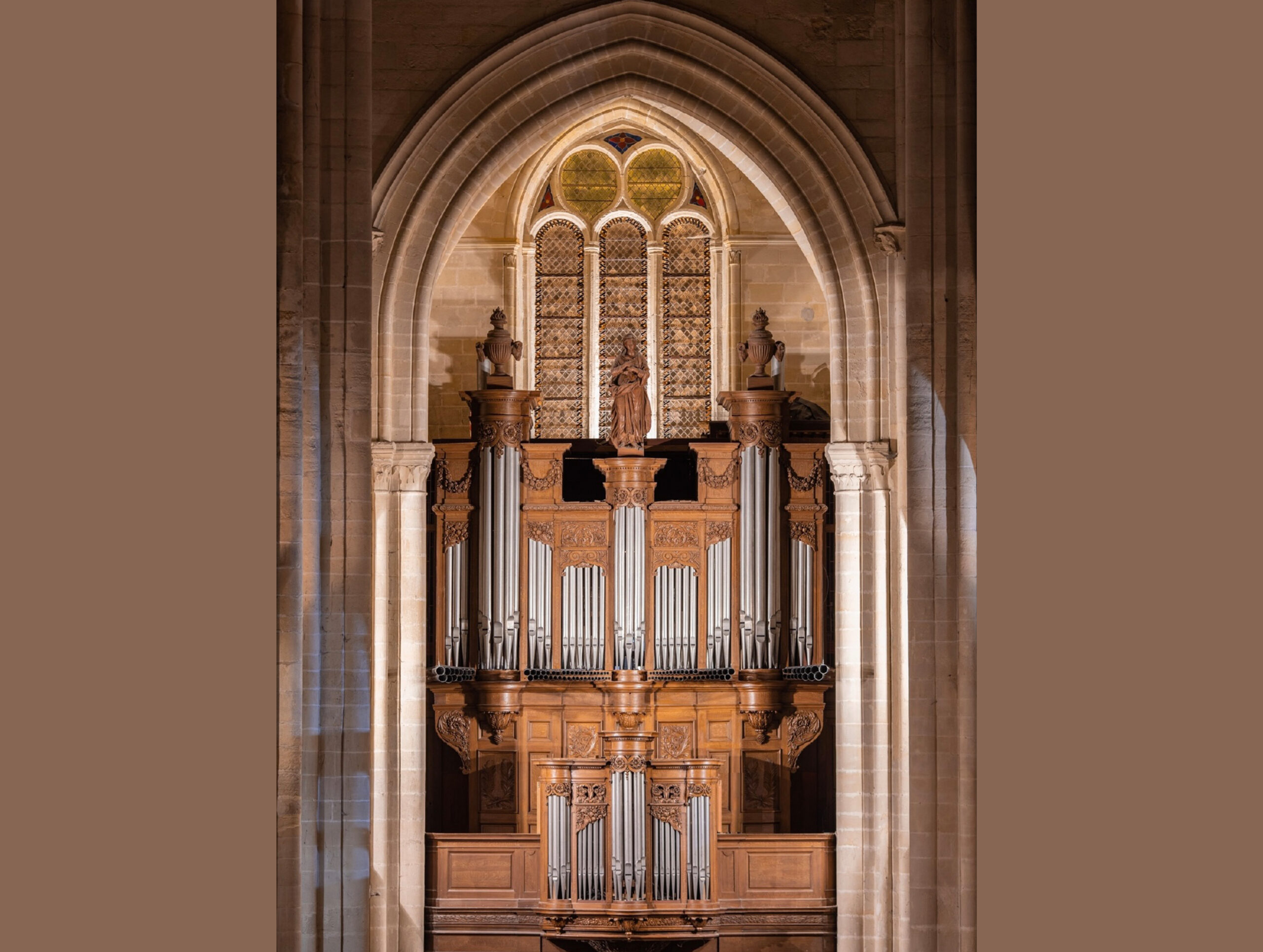 1972 – 1974 L’organiste titulaire de la cathédrale, Claude Moreau, fait appel au facteur Roger Lambert pour enrichir l’instrument sur les conseils de maître Marcel Dupré. Le positif de dos est restitué ainsi qu’une console en fenêtre. Les jeux du 19ème siècle sont complétés par de nouveaux jeux dont deux rangs de trompettes placées en chamade. L’orgue comporte alors quatre claviers et pédalier et un ensemble de soixante-trois jeux pour un total de 3882 tuyaux.